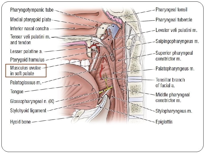 PALATINE APONEUROSIS Fibrous sheath Attached to posterior border of hard palate Is expanded tendon of tensor velli palatini Splits to enclose musculus uvulae Gives origin & insertion to palatine muscles 1. Uvula is the median conical projection marked by median raphe. 2. Palatine arches are free margins of the soft palate and splitting into two parts as they approach the lateral wall. a. Palatoglossal arch or anterior pillar of fauces or anterior palatine arch encloses the palatoglossus muscle. b. Palatapharyngeal arch or posterior pillar of fauces or posterior palatine arch encloses the palatopharyngeus muscle.