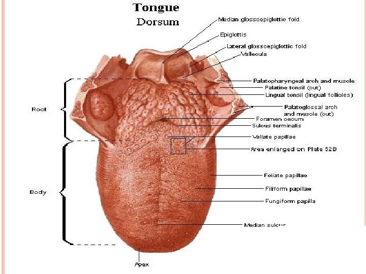 DORSAL SURFACE Divided into anterior two third and posterior one third by a Vshaped sulcus terminalis. The apex of the sulcus faces backward and is marked by a pit called the foramen cecum Foramen cecum, an embryological remnant, marks the site of the upper end of the thyroglossal duct Anterior two third: mucosa is rough, shows three types of papillae: § Filliform § Fungiform § Vallate Posterior one third: No papillae but shows nodular surface because of underlying lymphatic nodules, the lingual tonsils