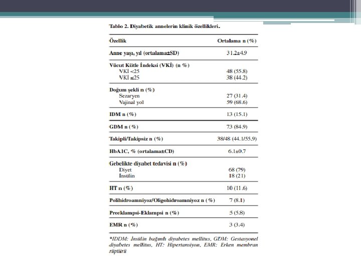 YÖNTEM • Tüm gebelerdeki Hb. A 1 c değeri 6. 1± 0. 7 (5. 0 -7. 9) iken, IDDM olan gebelerde ortalama Hb. A 1 c değeri 7. 2± 0. 4; GDM olan gebelerde ise 5. 9± 0. 6 saptandı ve aradaki fark istatistiksel olarak anlamlı kabul edildi. • Gebelikte diyabet tanısı alan annelerden 68’inde (% 79) kan şekeri düzeyi diyet ile regule edilirken, 18’inde (% 21) insülin gereksinimi oldu