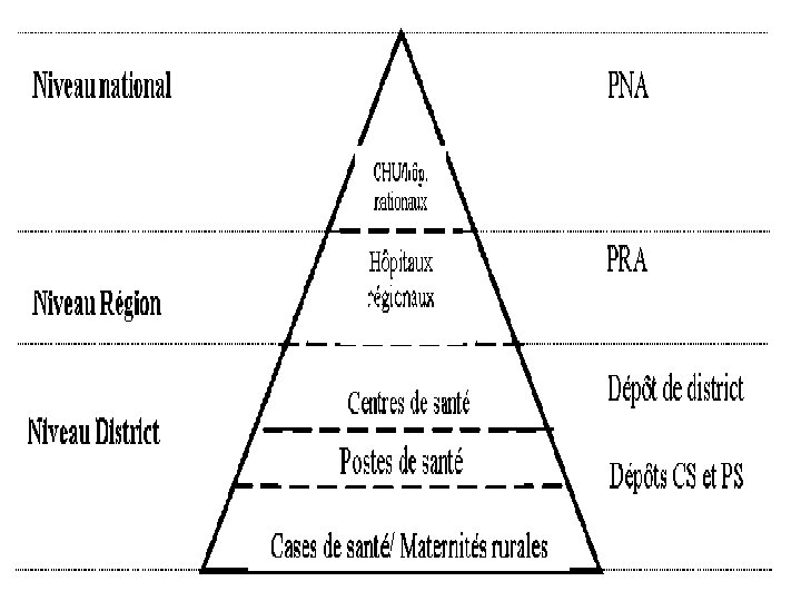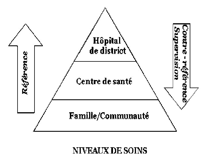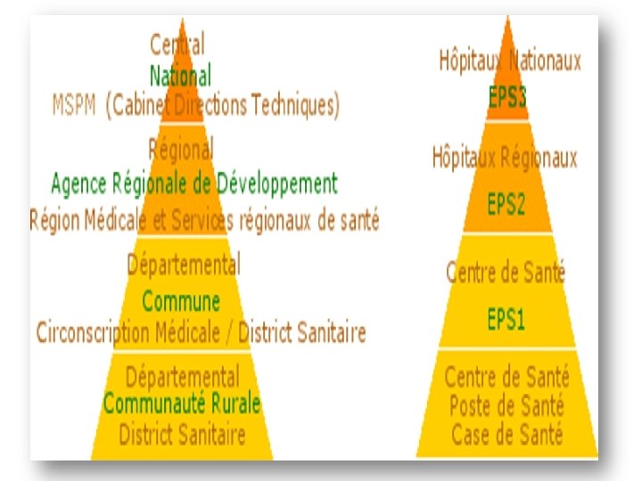 Organisation Systéme de santé - Le district sanitaire est constitué par: 1. un centre de santé ou hôpital de district ou centre de référence 2. des postes de santé et maternités rurales 3. Et les cases de santé. - L’organisation des soins est la suivante: 1. Soins primaires: postes de santé (Paquet Minimum d’Activités) 2. Soins secondaires : centre de santé et hôpital de district 3. Soins tertiaires: Hôpitaux régionaux et CHU (Soins spécialisés)
