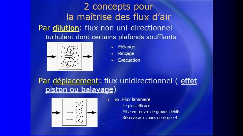 L’essentiel pour opérer l. Existence d’une surpression (= installation fonctionnelle) l. Propreté particulaire salle vide (= filtration efficace) l. Cinétique de décontamination (= taux de brassage) l. Ou vitesse du flux aux points critiques (= effet piston) l. Comportement des professionnels (= formation à l’outil)