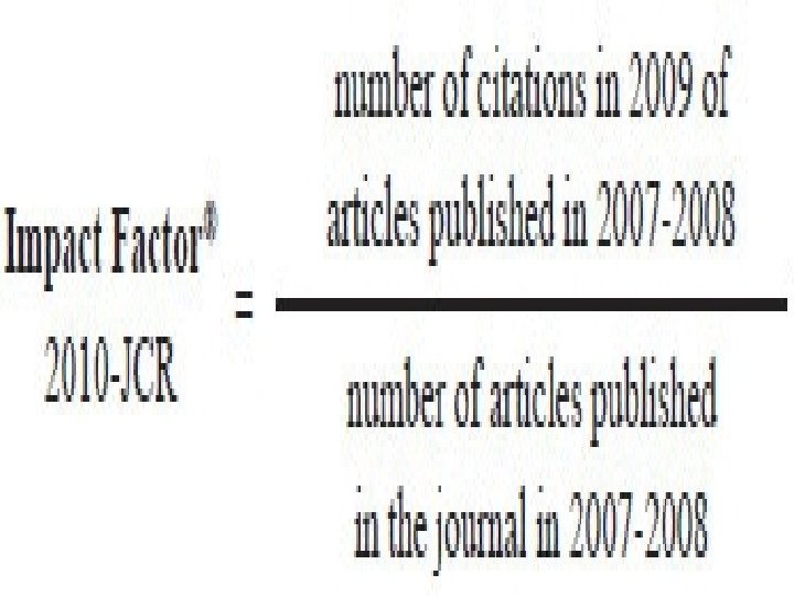 Key points related to Journal Impact factor � Journal Impact Factor can not be calculated for new journals. I mean “the impact factor of a journal is calculated by dividing the number of current year citations to the source items published in that journal during the previous two years”, hence impact factor can be calculated after completing the minimum of 3 years of publication. � Journal Impact Factor will be a quotient factor only and will not be a quality factor.