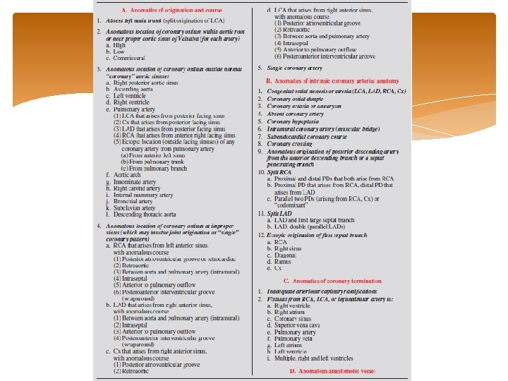 Anomalies of origination and course Sudden cardiac death associated with four risk factors • Slit-like coronary orifice • Acute angle of take-off from aorta • Presence of aortic intramural coronary arteries • Inter-arterial course between aorta and PA