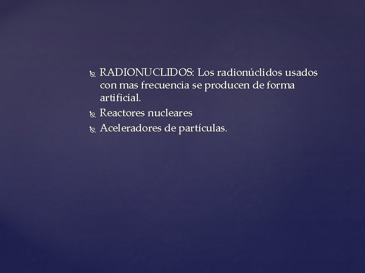 RADIONUCLIDOS: Los radionúclidos usados con mas frecuencia se producen de forma artificial. Reactores nucleares Aceleradores de partículas.