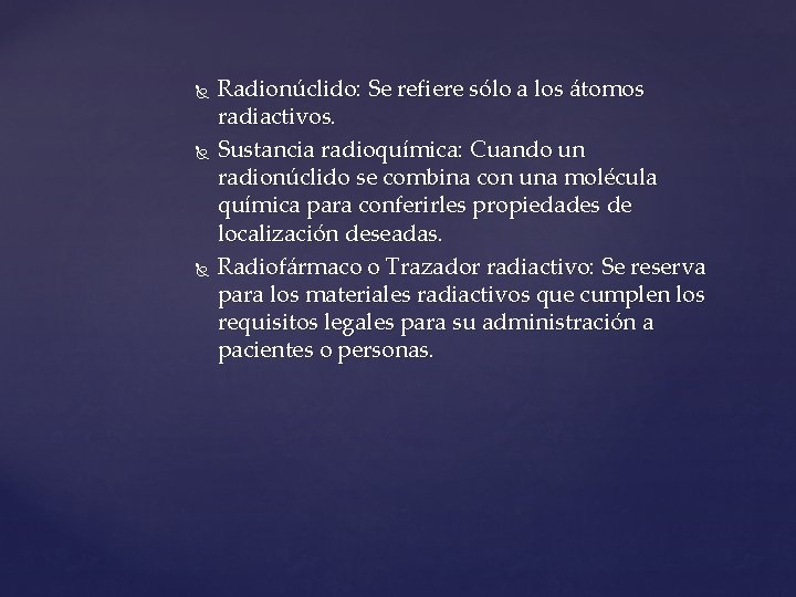 Radionúclido: Se refiere sólo a los átomos radiactivos. Sustancia radioquímica: Cuando un radionúclido se combina con una molécula química para conferirles propiedades de localización deseadas. Radiofármaco o Trazador radiactivo: Se reserva para los materiales radiactivos que cumplen los requisitos legales para su administración a pacientes o personas.