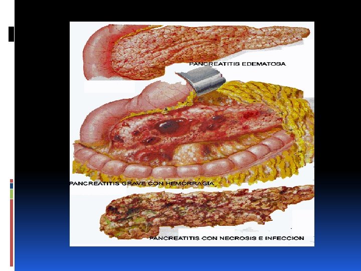 ANATOMÍA PATOLÓGICA Simposium de Atlanta. -Pancreatitis Edematosa (Intersticial): 80%. Curan de 5 -7 días. -Pancreatitis Necrohemorrágica: 20% 30% de Mortalidad. Forma Leve Forma Severa 80% total 20% total Menos de 5% mortalidad Más de 20% mortalidad Menos de 5% FOM Más de 20% FOM