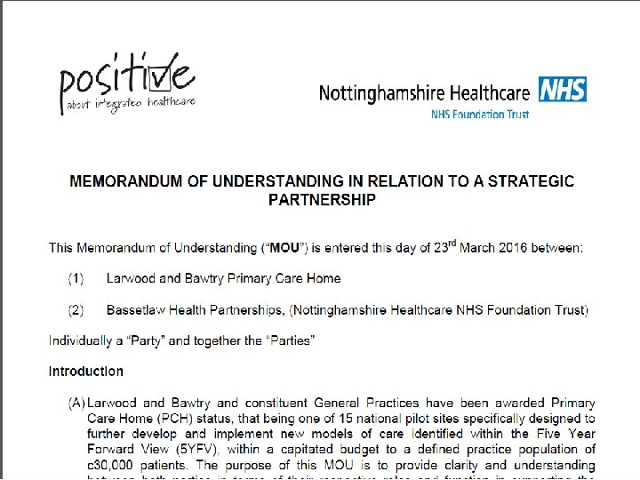 Larwood 5 sites, based in Worksop, North Nottinghamshire 32, 000 patients 16 Partners, 3 salaried GPs, 3 Nurse Practitioners High levels of health need, social isolation, substance misuse, smoking, obesity. Urgent care demand high Significant experience – commissioning and provision RCGP Quality Practice Award Outstanding CQC rating