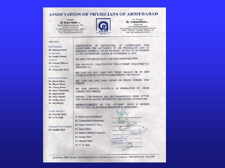 § After day 10, the committee declared that it is satisfied with following matter: § The protocol was strictly adhered to. § Mr. Jani has not passed or dribbled urine during these 10 days. § He has not taken anything by mouth or by any other route not even water for 10 days. § All his parameters are till date within physiological range. § He has shown evidence of formation of urine, which seems to be reabsorbed from his bladder wall. However at present the committee does not have any scientific explanation for the same but the help of senior scientists and medical personnel of the country is being taken for the same.