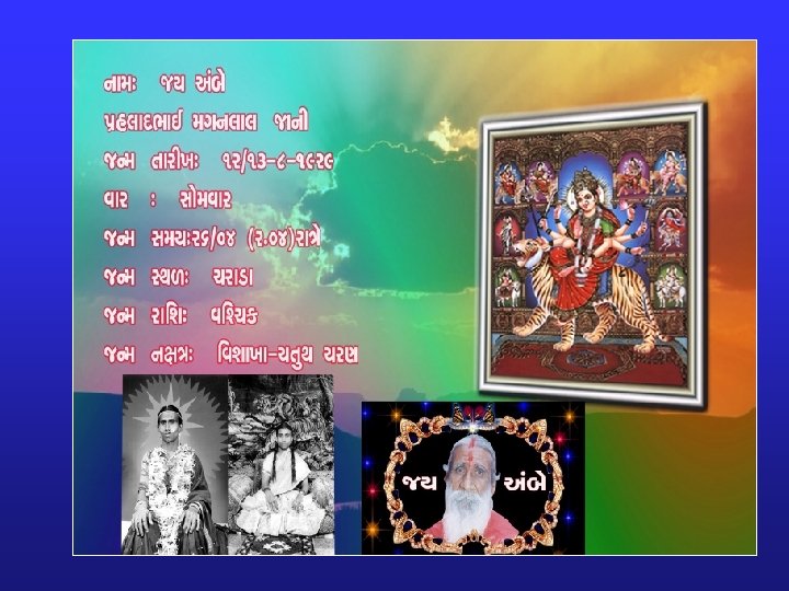 Introduction Name : Jay Ambe Prahaladbhai Maganlal Jani Date of Birth : 12 -13/08/1929, Monday Time of Birth : 2. 04 A. M. Place of Birth : Charada Moonsign : Scorpio Birth Nakshatra : Vishakha-Chaturtha Charan