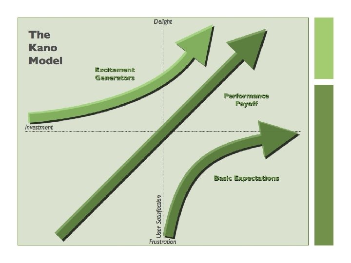 Kano model process • Analyze data from available sources • Brainstorm list of features and functionality • Determine type of requirements: – Output Requirements – Service Requirements • Kano Model Requirements Survey – User Survey • “Functional form” vs. “Dysfunctional Form” – “How would you feel if the product had feature X? ” – “How would you feel if the product didn’t have feature X? ” – Kano Questionnaire Answers: • I like it. • I expect it. • I’m neutral. • I can tolerate it. • I dislike it.