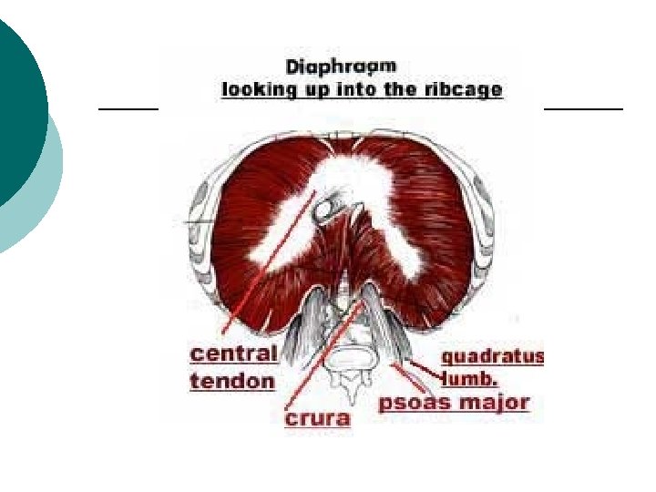 Role of Diaphragm ¡ Contraction of Diaphragm –piston movement. l l ¡ Range of Movement l l l ¡ Lower Ribs fixed and Vault Desends. Ant. Abd. Wall bulges. Central Tendon becomes fixed. Further contraction elevates lower ribs 1. 5 cms. in quiet breathing. . Surface area of Diaphragm = 270 sq. cm 1. 5 cm descent = increases 400 cc volume 4 th to 5 th costal cartilage after forced expiration. 6 -10 cm descend in forceful inspiration i. e. Goes upto 11 th to 12 th vertebra. Position of Diaphragm l l Highest in supine position. Then in erect position. Lowest in sitting position. Higher on that side on which the body lies.