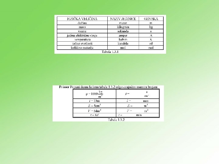 Dogovorom je izabrano sedam fizičkih veličina za osnovne jedinice. Jedinice koje se dobijaju preko osnovnih izvedene jedinice. n Skup osnovnih i izvedenih jedinica se naziva sistem jedinica. Na međunarodnoj konferenciji 1960. godine usvojen je međunarodni sistem jedinica (SI). Na tom skupu za osnovne fizičke veličine uvedene su jedinice koje su date u tabeli 1. 3. 1.