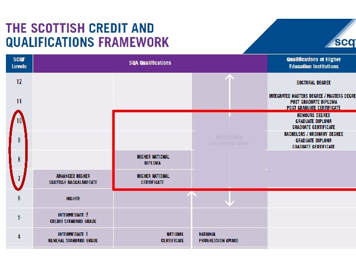 Scottish Credit and Qualifications Framework (SCQF) • SCQF outlines the relationship and equivalences of the different qualifications available in Scotland. • Enables learners to progress their education, moving between sectors with no loss of time. • Articulation agreements are underpinned by SCQF.