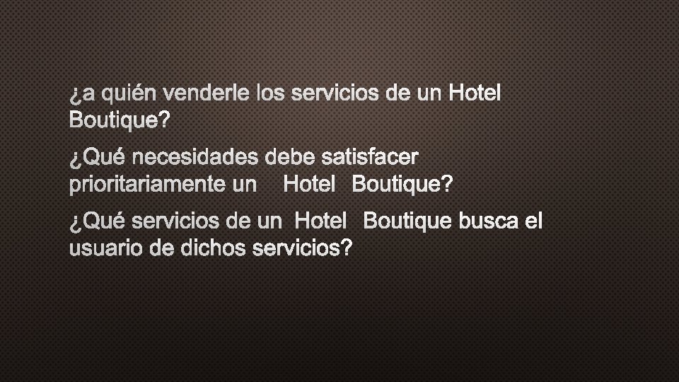 Característica Número reducido de Definición La cantidad de habitaciones oscila entre 20 y 80. habitaciones. Espacio limitado para eventos. Los eventos no deben superar el 10 o 15% de la demanda semanal. Sobre esa cifra, el hotel comienza a perder su personalidad. Lobbies pequeños. Las recepciones son de menor tamaño que las de los hoteles convencionales. Así, la experiencia de los huéspedes será mucho más íntima. Atención personalizada. Es imposible ofrecer un servicio boutique sin ser cuidadosos de los detalles y de la atención a los huéspedes. Conservación del patrimonio. Los hoteles boutique, generalmente se encuentran ubicados en mansiones históricas o edificaciones con gran valor arquitectónico, que fueron reacondicionadas para brindarle al huésped todas las comodidades y servicios propios de los hoteles más exclusivos. Ofrecen una infraestructura moderna y detalles decorativos propios del siglo XXI. Otra rama de las boutiques son los denominados design hoteles, que se caracterizan por ofrecer los últimos adelantos tecnológicos disponibles, además de un diseño vanguardista. Sentido de la estética y de la La mayoría de estos hoteles se caracteriza por su diseño ecléctico y por ofrecer servicios vanguardia tecnológicos a sus clientes como wi-fi gratuito, sala para videoconferencias, etc. La ubicación no importa. Si un hotel boutique tiene todas las características mencionados anteriormente, a los huéspedes no les importará viajar unos kilómetros más para alojarse en ese lugar ya que lo más importante es el concepto y la experiencia CARACTERÍSTICA S DE UN HOTEL BOUTIQUE