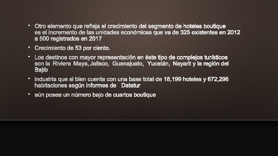 EN MÉXICO… • 2011, LA DIRECCIÓN GENERAL DE MEJORA REGULATORIA DE LA SECRETARÍA DE TURISMO, EN COLABORACIÓN CON ELCONSEJO NACIONAL DE CIENCIA Y TECNOLOGÍA (CONACYT) Y EL CENTRO DE ESTUDIOS SUPERIORES EN TURISMO (CESTUR), SE CREA EL NUEVO E INTEGRADO SISTEMA DE CLASIFICACIÓN HOTELERA (#SHC) REGULADO POR LA SECRETARIA DE TURISMO (SECTUR). • CON ESTE SISTEMA SE ORDENA, ESTANDARIZA Y HOMOLOGA LA CATEGORÍA DE ESTABLECIMIENTOS HOTELEROS EN EL PAÍS CON BASE EN UN NÚMERO QUE VA DE MEDIA A CINCO ESTRELLAS; PROMOVIENDO E INCREMENTANDO LA PRODUCTIVIDAD; ADEMÁS DE MEJORAR LA ACCESIBILIDAD Y SUSTENTABILIDAD DE LOS SERVICIOS HOTELEROS. • EN 2012 ALREDEDOR DE 146 MIL TURISTAS EXTRANJEROS PREFIRIERON HOSPEDARSE EN HOTELES BOUTIQUE, MIENTRAS QUE PARA 2017 LA CIFRA LLEGÓ A 700 MIL; LO CUAL REPRESENTA UN INCREMENTO DEL 379 POR CIENTO.