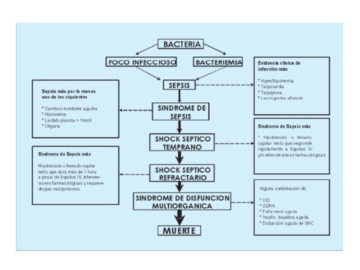 CLASIFICACION DE SEPSIS SEGÚN EVOLUCION Temperatura >38. O < 36. C Taquicardia Bradipnea o polipnea Leucopenia o leucocitosis y 10% Bandas. Sepsis + Disfuncion organica Aumento creatinina Alteración del estado mental Elevación del lactato Hipotensión con respuesta a fluidos Sepsis severa + Hipotensión que no responde a fluidos.