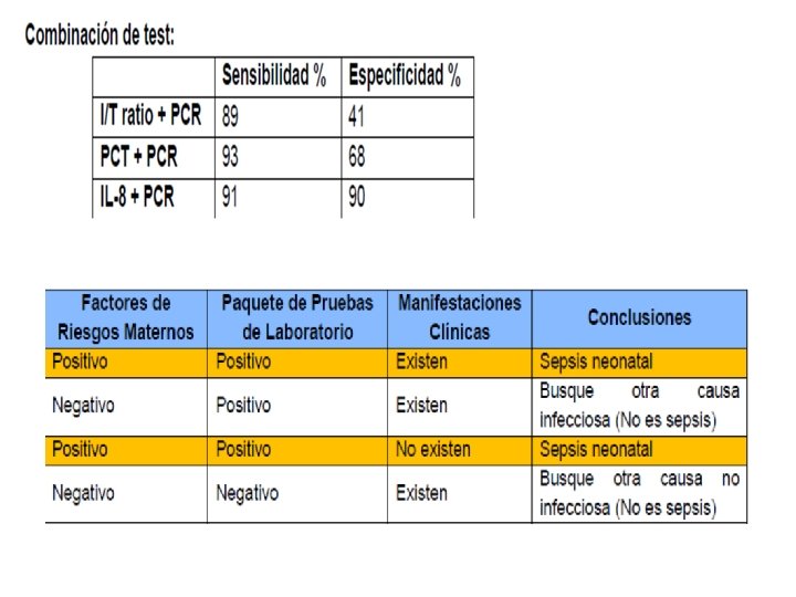 PCR • Incrementa a las 6 -8 horas de una infeccion y alcanza un pico a las 24 hrs • La sensibilidad (probabilidad de un enfermo de dar + en una prueba) es baja por que requiere una respuesta inflamatoria • Benitz et al, demostro que , 2 PCR normal (8– 24 hrs de vida ) tiene un VPN ( probabilidad de px con prueba negativa de no tener la enfermedad) de 99. 7% • Valor > 10 mg/L