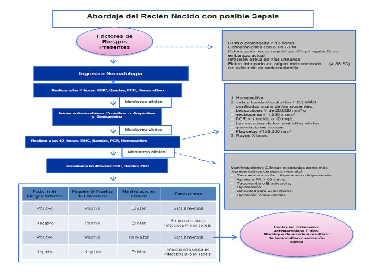 Si no hay crecimiento bacteriano en el segundo reporte y el segundo paquete de 4 pruebas de laboratorio indica que no hay respuesta inflamatoria que sugiera sepsis, se le debe suspender los antimicrobianos y autoriza el egreso (sin antimicrobianos) a las 48 horas de su ingreso; así mismo, citarlo a las 48 horas para constatar que todo marcha bien, SALVO en aquellos casos en los que exista otra causa por la cual el recién nacido deba permanecer ingresado en la sala. �En sospecha no confirmada en RN asintomático: 3 días de tratamiento antibiótico. �En probable sepsis: 7 a 10 días de antibiótico. �En sepsis con Meningitis de 14 a 21 días.
