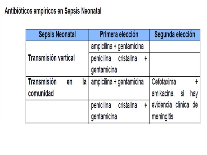 ü El patogeno mas comun responsable de sepsis neonatal temprana es Estreptococos Grupo B y Escherichia Coli; siendo util una combinacion de Ampicilina ( B- lactamico ) y Amikacina (aminoglusidos) para inducir sinergia aun para Listeria. ü Se considero cefotaxima 2 linea ya que presento rapida resistencia, ademas de que el tratamiento prolongado es riesgo alto de candidiasis invasiva. Ya que tiene penetracion alta SNC se retringue a uso en sospecha Meningitis atribuibles a GRAM NEGATIVOS ü Ceftriaxona contraindicado por inducir hiperbilirrubinemia.