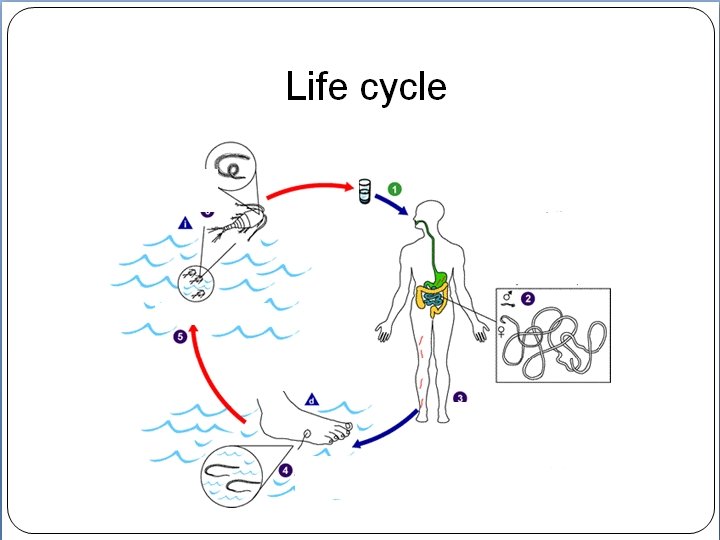 LIFE CYCLE. Definitive host- Man harbor the adult in the sub cutaneous tissue. Intermediate host- Water crustaciancyclops, larvae undergoes developmental changes Each cyclops can ingest 15— 20 larvae.