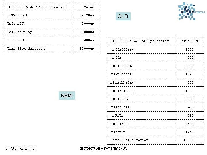 Time slot internal timing diagram /---------- Time Slot duration ----------/ | /ts. Short. GT/ | | | |------------+----------+------| TX | | TX-Packet | |RX Ack| | |------------+----------+------| |/ts. Tx. Offset/| | | |------------+----------+------| RX | | RX-Packet | |TX Ack| | |-----+--+--+--------------+------| | | | | /ts. Long. GT/ |/Ts. Tx. Ack. Delay/| | | Start End of of Slot NEW 6 Ti. SCH@IETF 91 OLD /-------------- Time Slot duration -----------/ | /ts. Ack. Wait/ | | | /ts. Rx. Ack. Delay/| | |-----------+---------+--------+------| TX | /1/ /3/ /2/ | TX-Packet | |RX Ack| | |-----+--------+---------------+------| |/ ts. Tx. Offset /| | | |-----------+---------+--------+------| RX | | RX-Packet | |TX Ack| | |---------+--+--+---------------+------| | | | | /ts. Rx. Wait/ |/ts. Tx. Ack. Delay/ | | | Start End of of Slot /1/ ts. CCAOffset /2/ ts. Rx. Tx /3/ ts. CCA draft-ietf-6 tisch-minimal-03