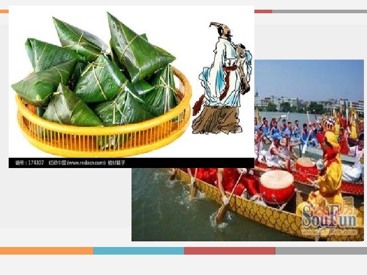 Dragon Boat Festival the date 5 th day of the 5 th lunar month the origin There are many legends about the evolution of the festival, the most popular of which is in commemoration of Qu Yuan (340 -278 BC). Qu Yuan was minister of the State of Chu and one of China's earliest poets. In 278 BC, he heard the news that Qin troops had finally conquered Chu's capital, so he finished his last piece Huai Sha (Embracing Sand) and plunged himself into the Miluo River, clasping his arms to a large stone. The day happened to be the 5 th of the 5 th month in the Chinese lunar calendar. 公元前278年,秦军攻破楚国京都。屈原眼看自己的 祖国被侵略,心如刀割,但是始终不忍舍弃自己的祖国,于五月五 日,在写下了绝笔作《怀沙》之后,抱石投汨罗江身死,以自己的 生命谱写了一曲壮丽的爱国主义乐章。