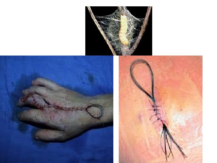 4) Le fuseau de crin ou crins de Florence – Un petit faisceau monté sur 2 orifices : une entrée + une sortie. – Petites plaies au niveau du visage, au niveau anal, … sur des abcès. – Fil obtenu à partir du ver à soie ou chenille de Bombyx mori, très connu des chnois.