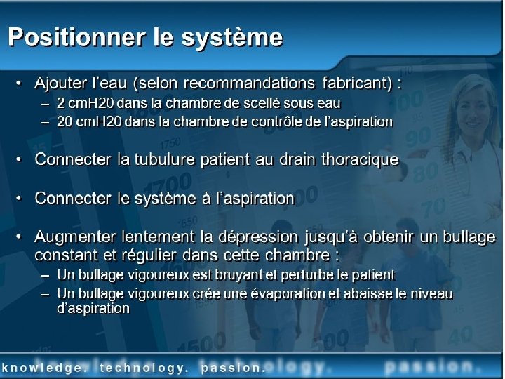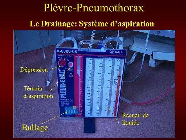 Surveillance des appareillages • Système de drainage : passif, actif, matériel d’aspiration, normes d’aspiration, prescription. • Installation du matériel : déclive, porte-bocaux, poche, matériel d’aspiration, quantité relevé et heure, numération des flacons. • Perméabilité. • Intégrité du système.