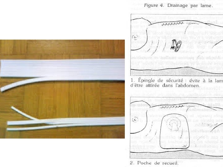 Drainage passifs : A/ Par capillarité 1) Les lames – Souvent : abcès, chirurgie digestive, péritonite, appendicite, permettant le drainage des sérosités abdominales. – o Fixées avec un fil, avec une épingle à nourrice pour éviter qu’elle n’ « entre » . – o Au moment où l’on enlève le pansement, être méticuleux de façon à ne pas enlever la lame avec.