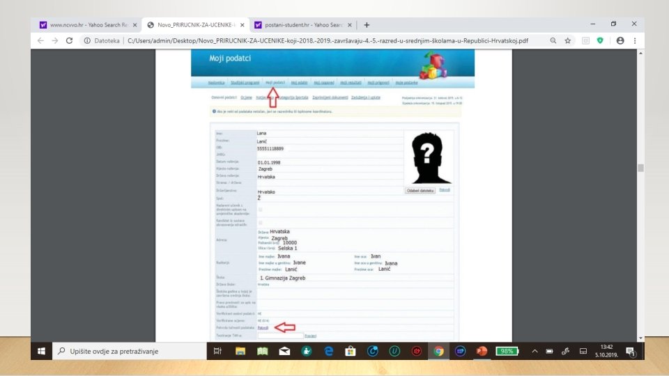 POSTUPAK PROVJERE I POTVRĐIVANJE OSOBNIH PODATAKA • Učenik pod poveznicom Moji podatci provjerava ispravnost osobnih podataka. Ako neki od osobnih podataka nije ispravan potrebno je od administratora školskoga imenika zatražiti ispravak • Pod poveznicom Moje postavke provjeriti ispravnost broja mobitela i e-pošte • UČNIK NE SMIJE POTVRDITI NEISPRAVE PODATKE • Ispravak će biti vidljiv na stranici učenika pod poveznicom Moji podatci nakon sljedeće sinkronizacije. Sinkronizacija školske • e-Matice i NISp. VU sustava provodi se dva puta dnevno. Nakon što su učeniku vidljivi ispravni osobni podatci učenik treba potvrditi njihovu ispravnost.