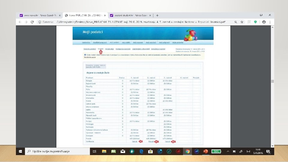 POSTUPAK PROVJERE I POTVRDA ISPRAVNOSTI OCJENA • Učenik na svojoj stranici u NISp. VU treba imati iste ocjene koje su iskazane na izdanim svjedodžbama. Ako ocjena iz nekog predmeta ne odgovara ocjeni koja je napisana na svjedodžbi potrebno je od razrednika ili administratora školskoga imenika zatražiti provjeru. Ispravak ocjene bit će vidljiv na stranici učenika pod poveznicom Moji podatci/Ocjene nakon sljedeće sinkronizacije. Nakon što su učeniku vidljive sve ispravne ocjene, učenik treba potvrditi njihovu ispravnost.