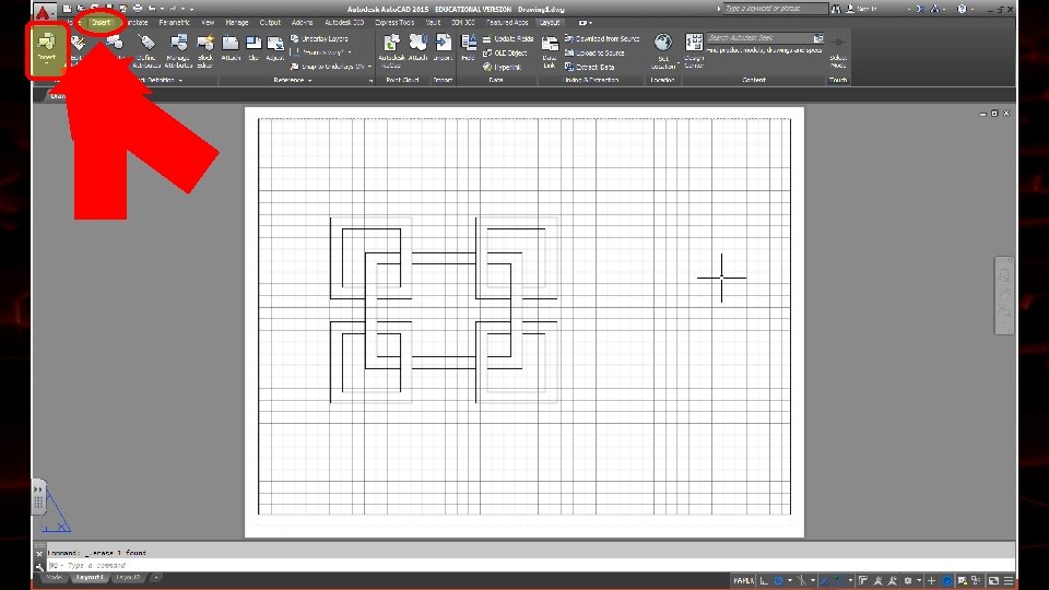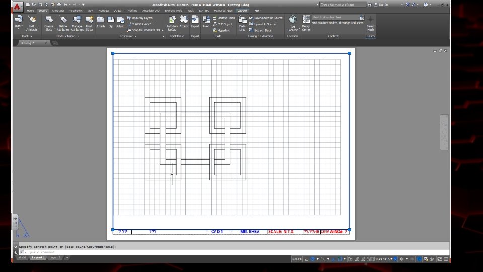 INSERTING A TITLEBLOCK 1. Click on the Layout tab at the bottom of your Workspace 2. Click on the Insert Tab at the top of the screen the INSERT button (or type INSERT) 3. Click on the BROWSE button 4. Browse to X: CAD and select WE - TB – 2016. dwg 5. Make sure the Insertion Point is 0, 0, 0 6. Make sure the Scale is 1, 1, 1 7. Click the OK button