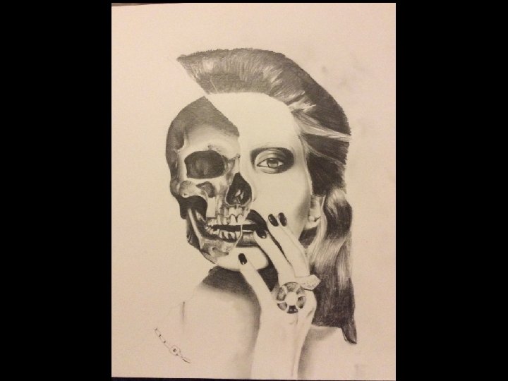 • This is 6 separate sheets of paper of drawing exercises you will do in 6 to 7 days. Next you will be given half of a print out of a celebrity face that you are to finish off using graphite pencils. • That last drawing is considered a project. The others are just assignments. Remember I grade on your efforts. If you are doing bad drawings and just whipping them out with very little effort so you have time to goof off in class do not expect a good grade. How ever if you try very hard and work very hard and do not feel you have good drawings, do not worry. I grade your efforts. I do take notes in my grade book on class room behavior. • Your Project assignment will include learning how to graph a picture of a skull, half of it, and marrying it with drawing the other half as a human face. The next few slides are samples to show you what I mean.