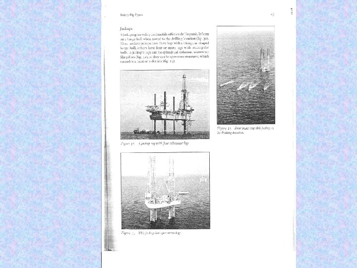 3. Submersible Rigs These rigs are towed on location and are capable of working in water depths from 18 to 70 feet. They are composed of an upper deck and lower hull connected by beams. On some types a large bottle, or something similar, is located on each corner of the rig for stability. These bottles, as well as the lower hull itself, are filled with water to set the rig on bottom and stabilize against movement. 4. Jack-up Rigs These rigs are normally towed on location, but a few are selfpropelled. They are composed of an upper deck supported by either three or more legs attached to mats or spud cans and are capable of working in water depths from 30 to 350 feet. These mats or cans rest on the ocean floor with the deck jacked up into drilling position. There are two common types of jack-up rigs; Bethlehem and Letourneau. The former uses stabilized column legs attached to mats while the latter uses three, truss-type legs mounted on spudcans.