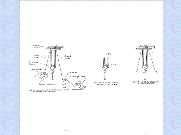 Principal Function: To provide a mechanical advantage which permits easier handling of large loads. M= Mechanical advantage F = tension in the fast line The ideal mechanical advantage that assumes no friction in the block and tackle can be determined from a force analysis of the travelling block. n Ff= W