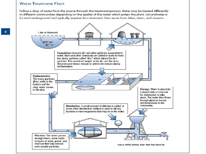 Distribution to Customers �An underground network of pipes typically delivers drinking water to the homes and businesses served by the water system. �Although water may be safe when leaving the water treatment plant it is important to ensure that this water does not become contaminated in the distribution system because of such things as water main breaks, pressure problems, or growth of microorganisms.