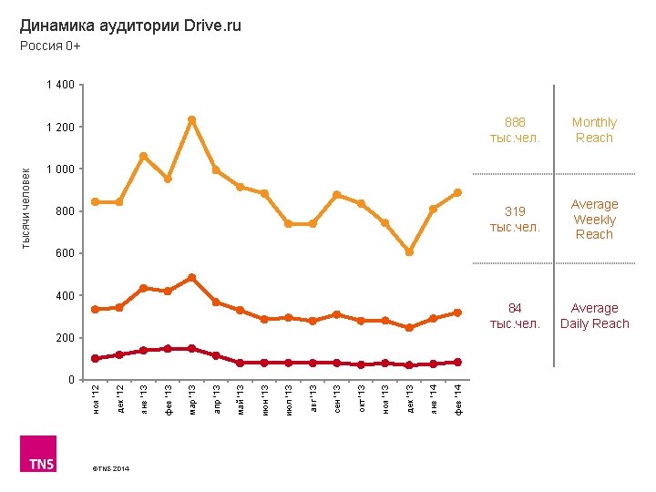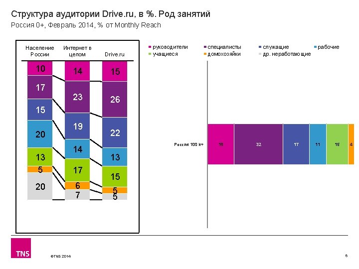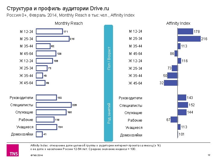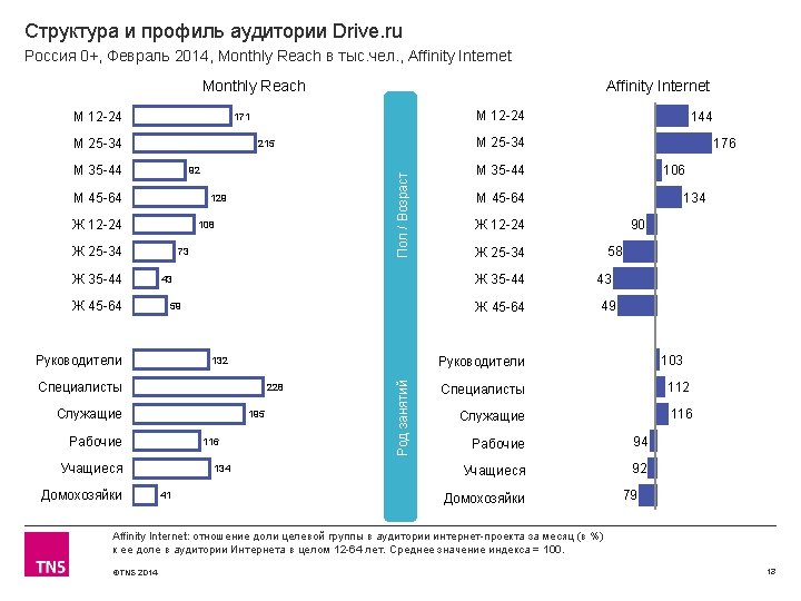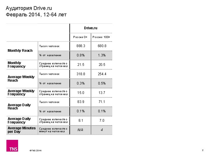 Drive ru 0 2014 Monthly Reach 11 13 Slides: 14 Download presentation Структура аудитории Drive. ru, в %. Пол / Возраст Россия 0+, Февраль 2014, % от Monthly Reach Население России Интернет в целом 11 13 11 Drive. ru М 12 -24 М 25 -34 М 35 -44 М 45 -64 Ж 12 -24 Ж 25 -34 Ж 35 -44 Ж 45 -64 19 14 9 10 17 24 11 10 10 Россия 100 k+ 23 27 11 17 9 6 5 14 15 11 14 12 10 11 21 14 ©TNS 2014 8 5 7 4 3 Структура аудитории Drive. ru, в %. Пол / Возраст Россия 0+, Февраль 2014, % от Average Daily Reach Население России Интернет в целом 11 14 9 Drive. ru М 12 -24 М 25 -34 М 35 -44 М 45 -64 Ж 12 -24 Ж 25 -34 Ж 35 -44 Ж 45 -64 29 10 17 11 10 33 Россия 100 k+ 34 37 9 8 4 44 1 13 11 14 10 11 21 14 ©TNS 2014 9 7 5 5 9 3 5 Структура аудитории Drive. ru, в %. Пол / Возраст Россия 0+, Февраль 2014, % от Monthly Reach, % от Average Weekly Reach, % от Average Daily Reach М 12 -24 М 25 -34 Monthly Reach 19, 3 24, 1 10, 3 14, 5 12, 1 8, 2 4, 8 6, 6 Average Weekly Reach 23, 4 26, 4 10, 3 12, 1 9, 2 6, 9 6, 8 5, 0 Average Daily Reach 29, 3 32, 9 8, 9 7, 3 5, 3 4, 9 8, 7 2, 6 ©TNS 2014 М 35 -44 М 45 -64 Ж 12 -24 Ж 25 -34 Ж 35 -44 Ж 45 -64 10 Структура аудитории Drive. ru, в %. Род занятий Россия 0+, Февраль 2014, % от Monthly Reach, % от Average Weekly Reach, % от Average Daily Reach руководители специалисты служащие рабочие учащиеся домохозяйки другое Monthly Reach 14, 8 25, 7 22, 0 13, 1 15, 1 4, 6 4, 7 Average Weekly Reach 15, 5 26, 1 20, 9 13, 5 13, 7 4, 3 5, 9 Average Daily Reach 12, 8 33, 3 18, 9 13, 4 12, 1 2, 5 7, 1 ©TNS 2014 11