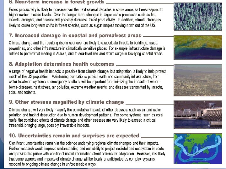 Challenges • Ecosystem response to multiple stresses, climate change in a broader context • Degree to which CO 2 fertilization operates • Dependencies of impacts on particular CO 2 concentrations • Costs and effectiveness of adaptation strategies • Interaction of domestic and international effects • Linkages to other issues, especially losses of biological diversity