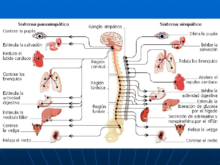 Simpático Relajación de la vesícula biliar n Relajación de los bronquios n Contracción de los esfínteres del tracto gastrointestinal n Midriasis n