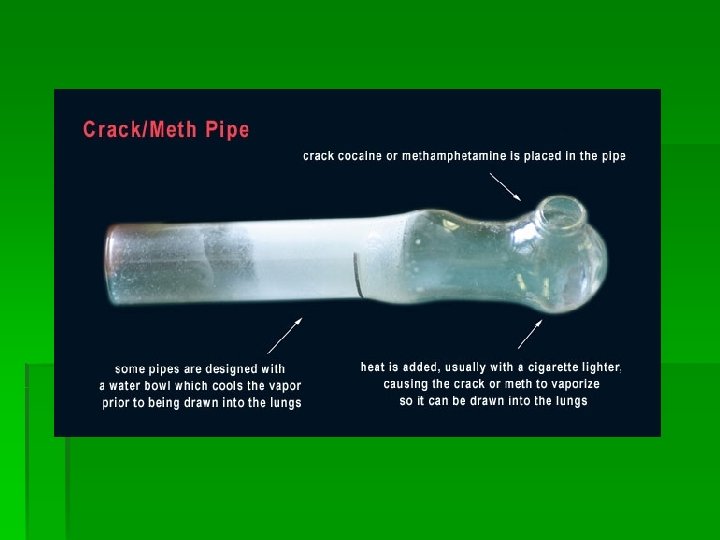 Dlhodobé účinky drog § Dlhodobé užívanie pervitínu môže poškodiť zuby a spôsobiť vážne problémy so zrakom, štítnou žľazou, s obličkami a pečeňou. § Šnupanie akejkoľvek látky môže poškodiť nosné sliznice. Platí to najmä o kokaíne. Inhalovanie kokaínu vedie k zúženiu krvných ciev, čo môže vyústiť do zápalu a poškodenia nosných slizníc. Pri pravidelnom šnupaní kokaínu sa vredy na sliznici nestačia zahojiť a stávajú sa „vstupnou bránou“ pre rôzne infekcie (preto sa užívateľom odporúča používať len vlastnú trubičku). Niekedy je poškodenie slizníc také vážne, že liečba vredov si vyžaduje chirurgický zákrok. Vo všeobecnosti platí, že pravidelnévnútronosné užívanie akejkoľvek látky nevyhnutne vedie k chronickej rinitíde.