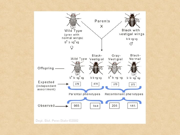 L’esperimento di Morgan(1) - Morgan eseguì incroci fra due genotipi di Drosophila: • b+ b vg+ vg x b b vg vg questi due genotipi differiscono per il colore del corpo e la forma delle ali b+ (colore corporeo grigio) è dominante su b (colore nero) vg+ (ali lunghe) è dominante su vg (ali corte)