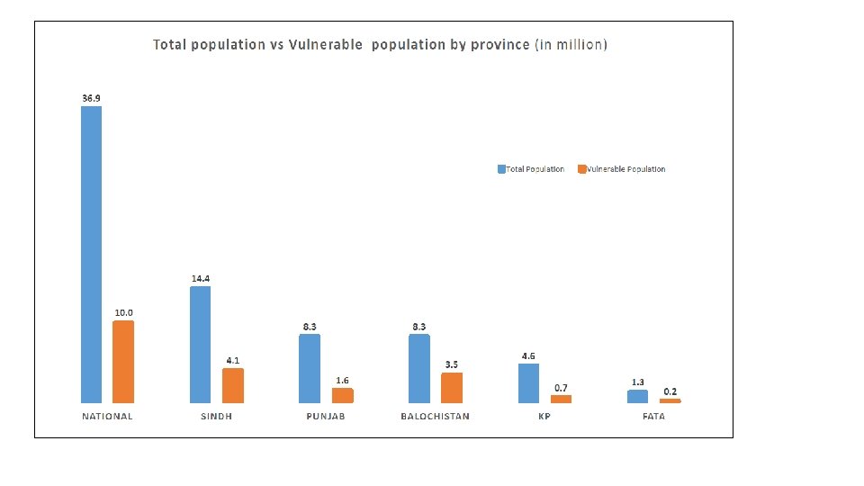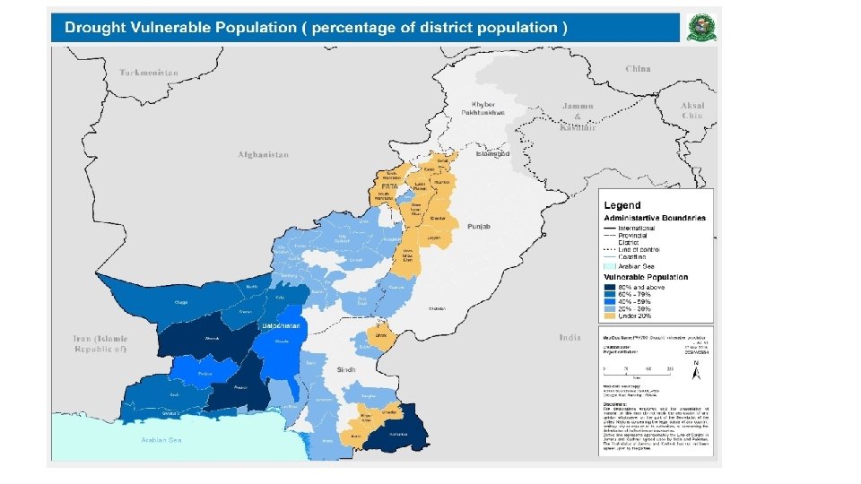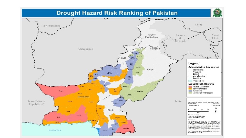 Droughts in historical perspective: • Major droughts recur in 12 -16 years cycle and lesser versions every 4 -6 years in the vulnerable regions; 1999 -2001 Drought: • Affected the entire country but Balochistan was worst affected followed by Sindh; • 3 million pop affected and 2. 5 million livestock lost; • 58 districts seriously affected, or which 23 were from Balochistan; • Agricultural growth registered negative 2. 5%. Losses estimated