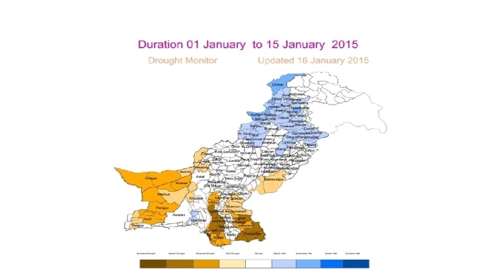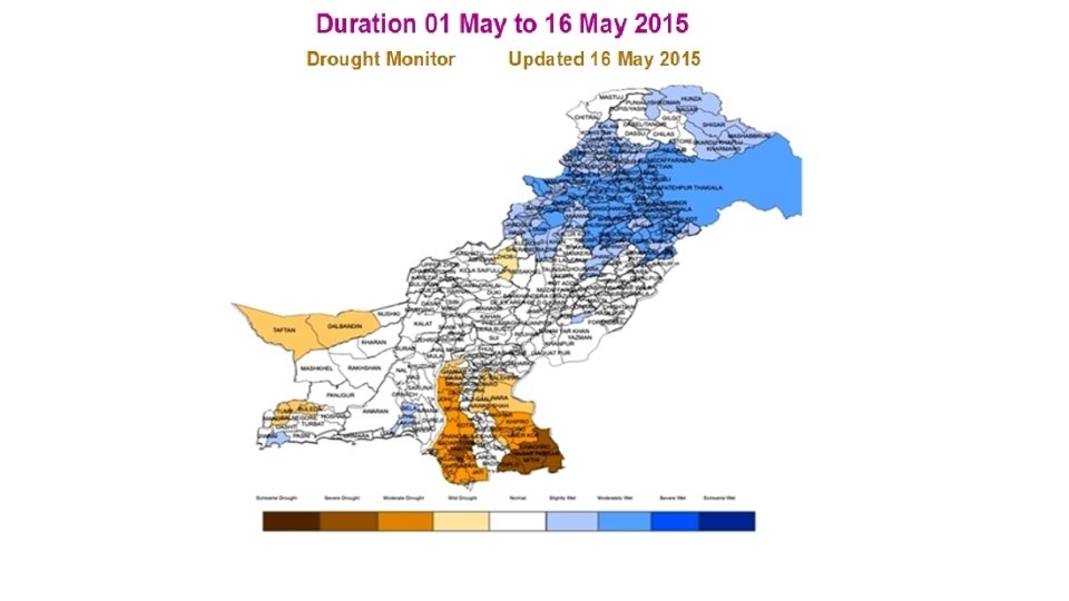 Present Drought Situation; Climate change aspect: • There is evidence to suggest that global warming has negatively impacted upon the Pakistan's environment, like causing loss of bio-diversity, shifts in the weather patterns and reduced fresh water supply. Climate change trends are synonymous with climate variability in terms of flash floods and drought incidence; • Prevalence of El Nino conditions;