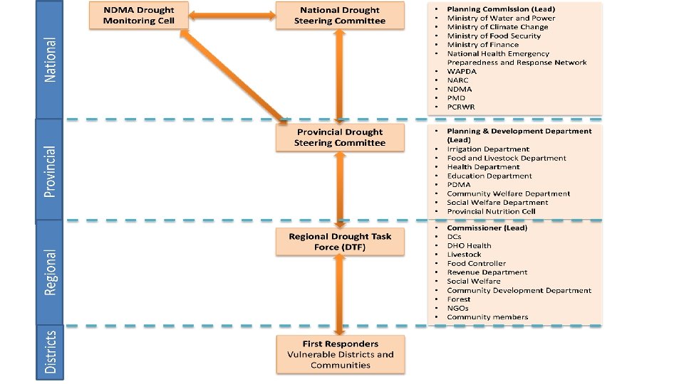 Drought Actors: • Federal Government: Planning Commission, WAPDA, Ministry of Climate Change, NHPREN, Ministry of Food Research, NDMA, PARC, PMD, SUPARCO; • Provincial Government: Departments: P&D, Food, Health, Livestock, Forest, Agriculture, Irrigation, PDMA, Provincial Nutrition Cell; • Districts: Relevant departments of the District Government led by the DC; • UN Agencies: WFP, UNICEF, FAO, WHO, UNDP, relevant NGOss