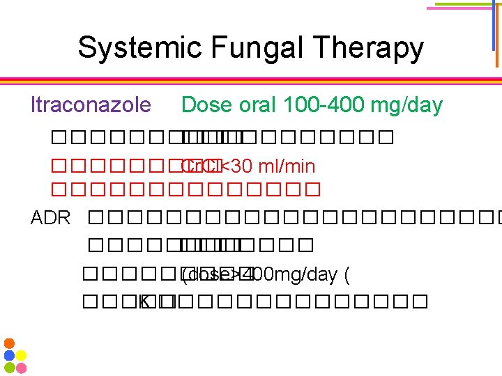 Systemic Fungal Therapy Fluconazole Adult 200 -400 mg/day Children ≥ 2 yrs Loading dose 6 -12 mg/kg/day Maintenance dose 3 -12 mg/kg/day ����������������� Cr. Cl DI Antacid, CYP 3 A 4(strong)->H 2 blocker, PPI>> fluconazole ADR ���������� ������ (dose>400 mg/day(