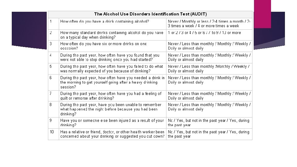 Screening Opportunistic Clinical presentation, e. g. smelling of alcohol Questionnaires CAGE Do you feel that you have to Cut down on your drinking Do people Annoy you by criticising your drinking Do you feel Guilty about your drinking Do you have to drink first thing in the morning (Eye opener) to steady your nerves AUDIT – see next slide Bloods LFT’s, GGT, FBC, B 12, Folate Blood alcohol breath test can be used to determine if a person has been drinking alcohol recently but does not diagnose alcoholism