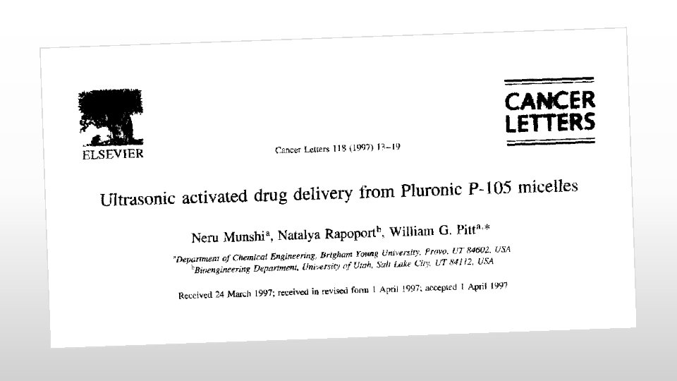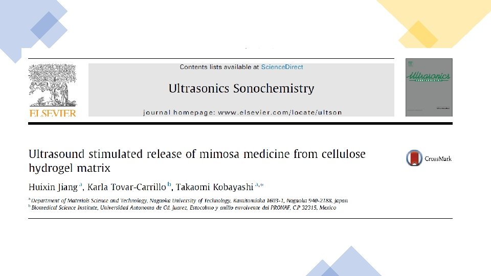 Refrences Dr. S. V Ranganayakulu , N. Ramakoteswara Rao and Leena Gahane. Ultrasound applications in Medical Sciences. International journal of modern trends in engineering and research 2016 Bhavana Joshi and Abhijeet Joshi. Ultrasound-based drug delivery systems. Huixin Jiang a , Karla Tovar-Carrillo b , Takaomi Kobayash. Ultrasound stimulated release of mimosa medicine from cellulose hydrogel matrix. Ultrasonics Sonochemistry 2016 Neru Munshi, Natalya Rapoportb, William G. Pitt. Ultrasonic activated drug delivery from Pluronic P- 105 micelles. Cancer Letters 1997 Samir Mitragotri. Healing sound: the use of ultrasound in drug delivery and otherapeutic applications. NATURE REVIEWS (Drug Discovery) 2005 Hangxun Xu, Brad W. Zeiger and Kenneth S. Suslick. Sonochemical synthesis of nanomaterials. Chem Soc Rev 2012 Sayan Ganguly, Poushali das, Madhuparna Bose, Tushar Kanti Das, Subhadip Mondal, Amit Kumar Das, Narayan C Das. Sonochemical green reduction to prepare Ag nanoparticles decorated graphene sheets for catalytic performance and antibacterial application. Ultrasonics Sonochemistry 2017 Anadi Gupta, Rohit Srivastava. Zinc oxide nanoleaves: A scalable disperser-assisted sonochemical approach for synthesis and an antibacterial application. Ultrasonics – Sonochemistry 2018