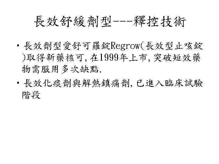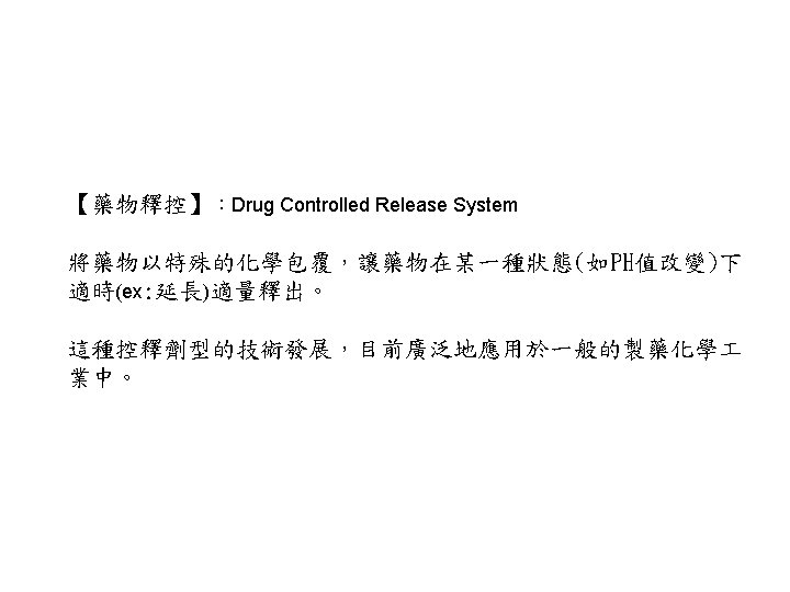 藥物釋控系統 1. 何謂藥物釋控 2. 發展釋控的優點 3. 藥物釋控的種類 A. Diffusion controlled B. Chemically controlled C. Solvent-activated controlled