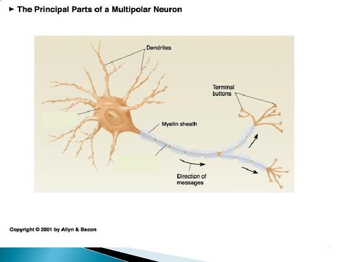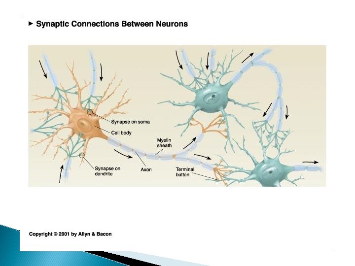 Some terms……. presynaptic ending – ◦ the portion of the axon that is conveying information to the next neuron synapse or synaptic cleft ◦ the space between neurons where communication occurs postsynaptic membrane ◦ the portion of the neuron (usually dendrite) that receives information