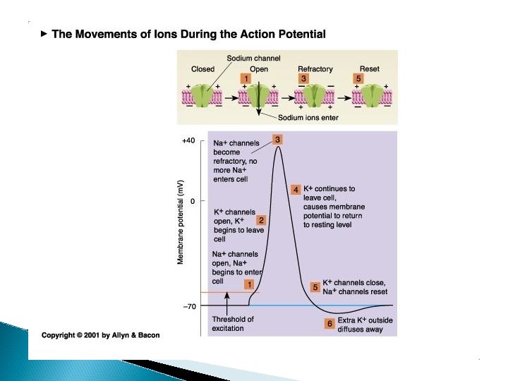 Neuron stimulated (either electrically or by receiving a “message” see depolarization (change from negative inside neuron to more positive) ◦ “threshold” – if a great enough depolarization occurs, an action potential will occur ◦ action potential – very quick – milliseconds Other terms – spike, firing, generating an AP